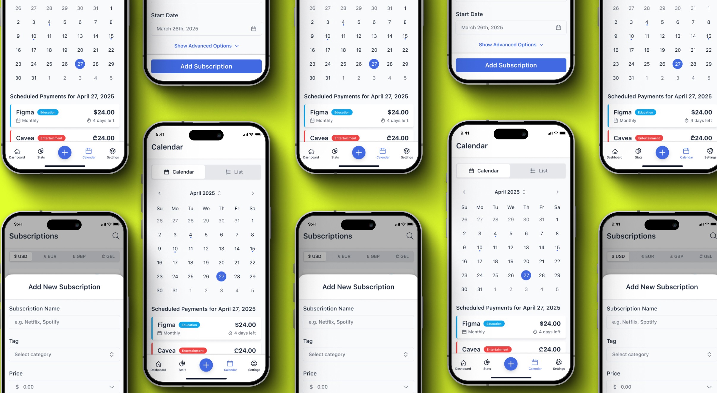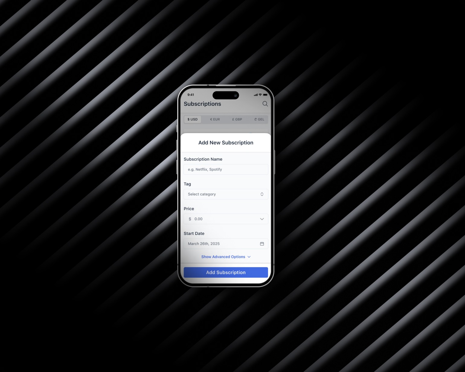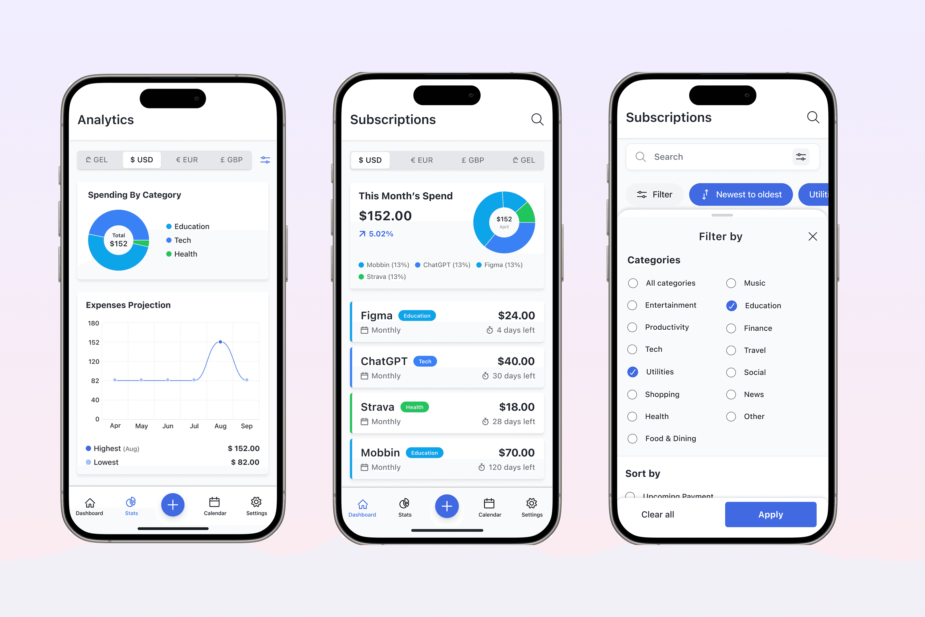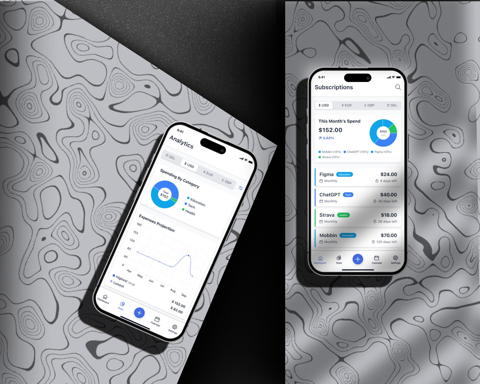 Designing a mobile app to help users track and manage subscriptions with reminders, spending insights, and full local privacy—from concept to prototype.
